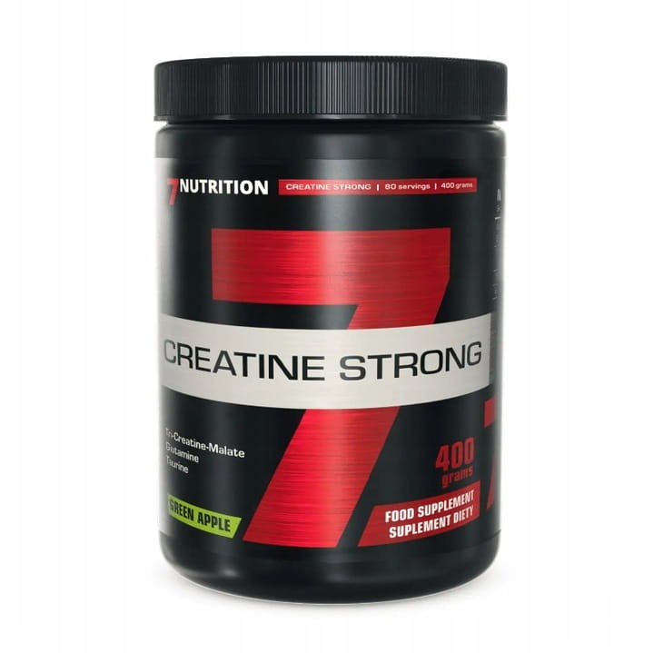 7Nutrition CREATINE STRONG 400 g. Suplement diety. Zmikronizowany jabłczan kreatyny z dodatkiem tauryny. Przeznaczony dla sportowców dyscyplin siłowo-wytrzymałościowych. Powoduje mniejszą retencję wody niż popularny monohydrat. Regularne stosowanie kreatyny zapewnia wzrost wytrzymałości, siły oraz masy mięśniowej.