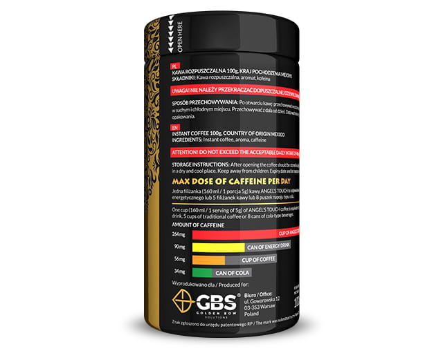 Piekielnie ciężki poranek? Czas na Angel’s Touch firmy GBS – kawę rozpuszczalną z wysoką zawartością kofeiny, która finezyjnie łączy aksamitną konsystencję z niebanalną nutą jednego z 23 dostępnych smaków. Moc i wyjątkowy aromat uzyskane w unikatowym procesie produkcji przenikają się, tworząc niezapomnianą kompozycję. Angel’s Touch niezaprzeczalnie stawia na nogi, żegna sen i wyzwala w Tobie pokłady energii na cały dzień!