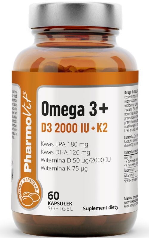 Omega 3 + D3 2000 IU + K2 to wysokiej jakości suplement diety, który łączy w sobie korzyści nienasyconych kwasów tłuszczowych Omega 3 pochodzących z oleju rybiego oraz witamin D i K – kluczowych dla zdrowia kości, serca i układu odpornościowego.