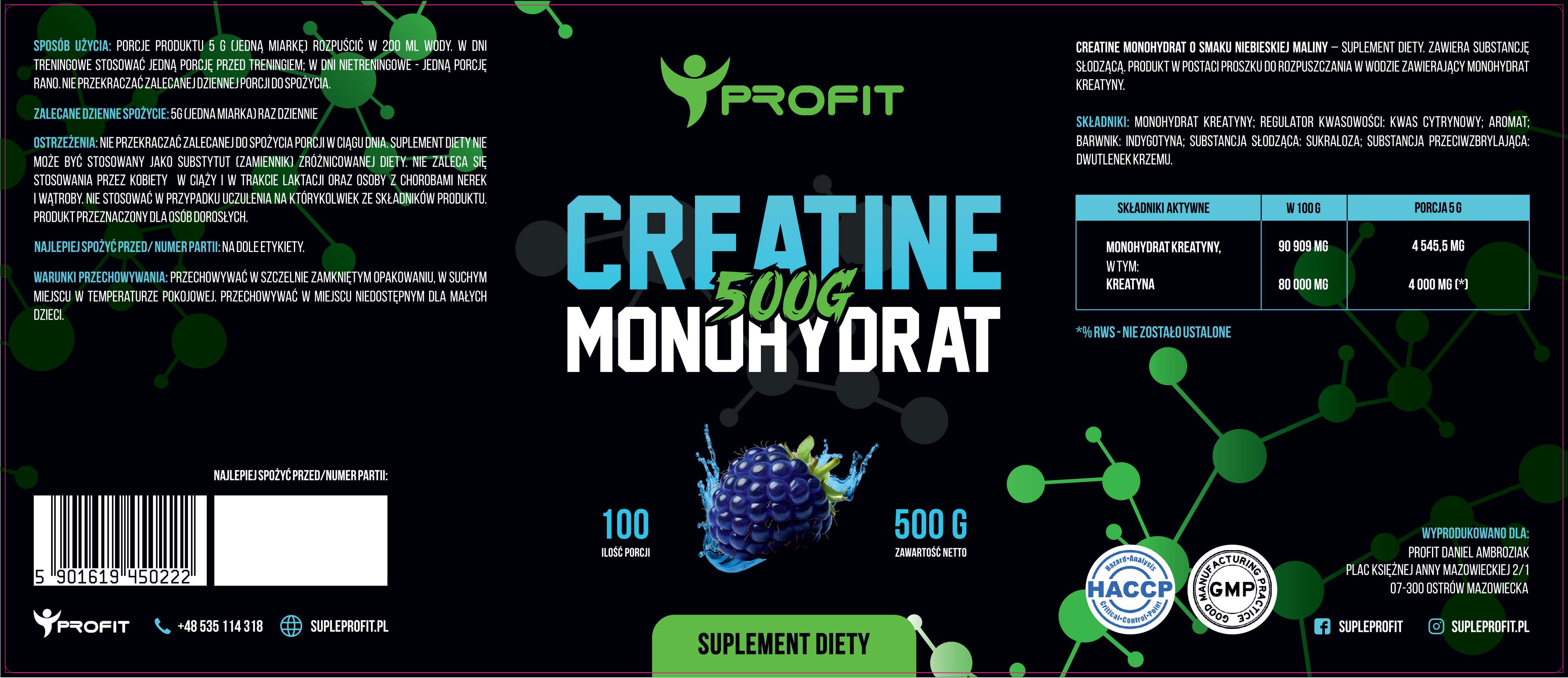 Kreatyna Monohydrat PROFIT Niebieska Malina 500 g – 100 porcji kreatyny o doskonałej rozpuszczalności