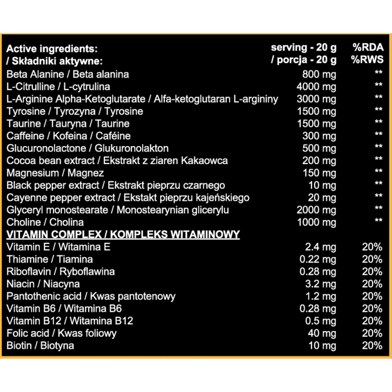 Beta alanina, kofeina, L-arginina, L-cytrulina, tyrozyna, tauryna, ekstrakt z ziaren kakaowca, witamina E, tiamina, ryboflawina, witamina B6, witamina B12, kwas pantotenowy, niacyna, kwas foliowy, biotyna, ekstrakt z pieprzu kajeńskiego, ekstrakt z pieprzu czarnego, cholina, magnez.